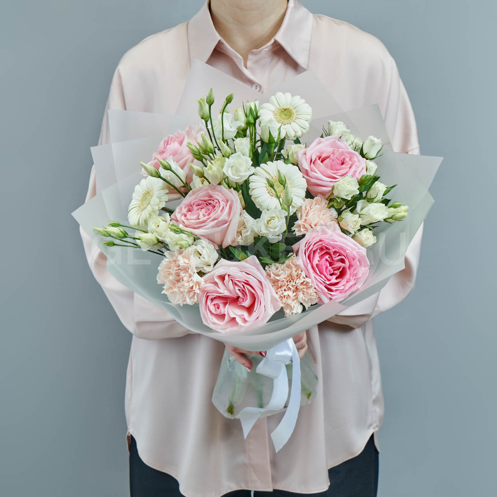 Букет из белых эустом, гербер и гвоздик с розами