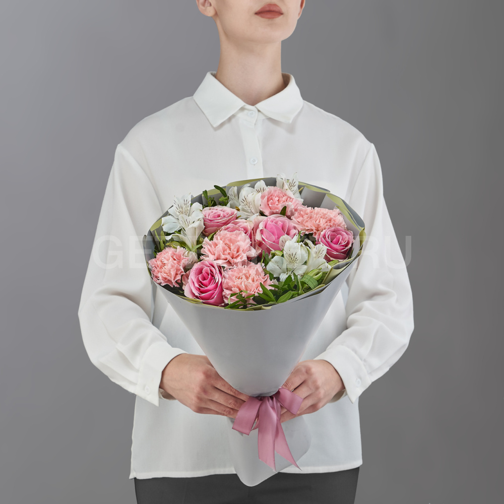 Букет из розовых гвоздик, роз и альстромерий4 065 ₽Букет из розовых гвоздик, роз и альстромерий 4 065 ₽ -