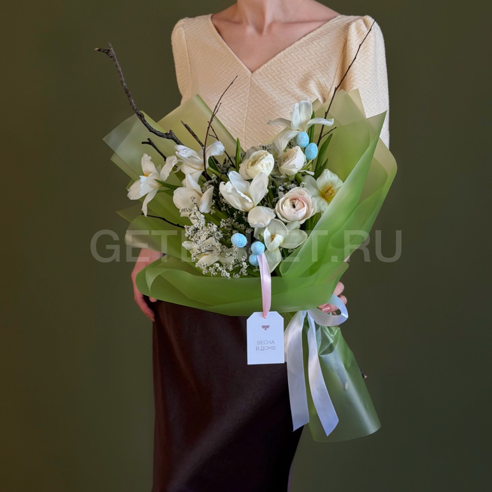 Пасхальный букет из гвоздик, кустовых роз и гербер с вербой5 850 ₽Пасхальный букет из гвоздик, кустовых роз и гербер с вербой 5 850 ₽ -
