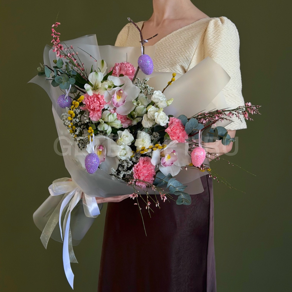 Пасхальный букет из орхидеи, вербы, генисты и лимониума с эустомой